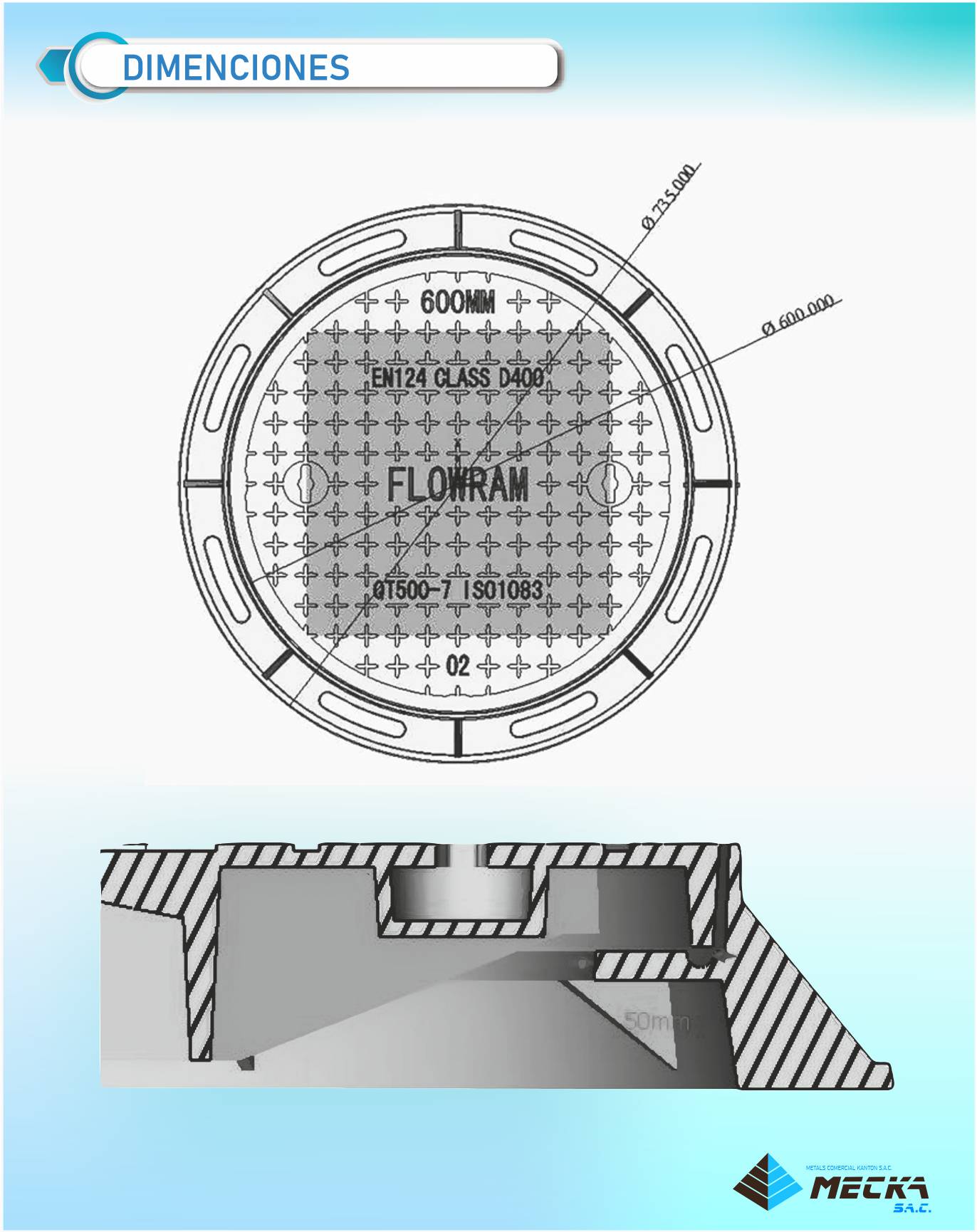 Los marco y tapa “FLOWRAM” cumplen con la norma EN 124 clase D400, la cual nos asegura un diámetro interior libre de 600 mm y una resistencia de carga axial de 40 toneladas siendo la indicada para zonas de alto tránsito.