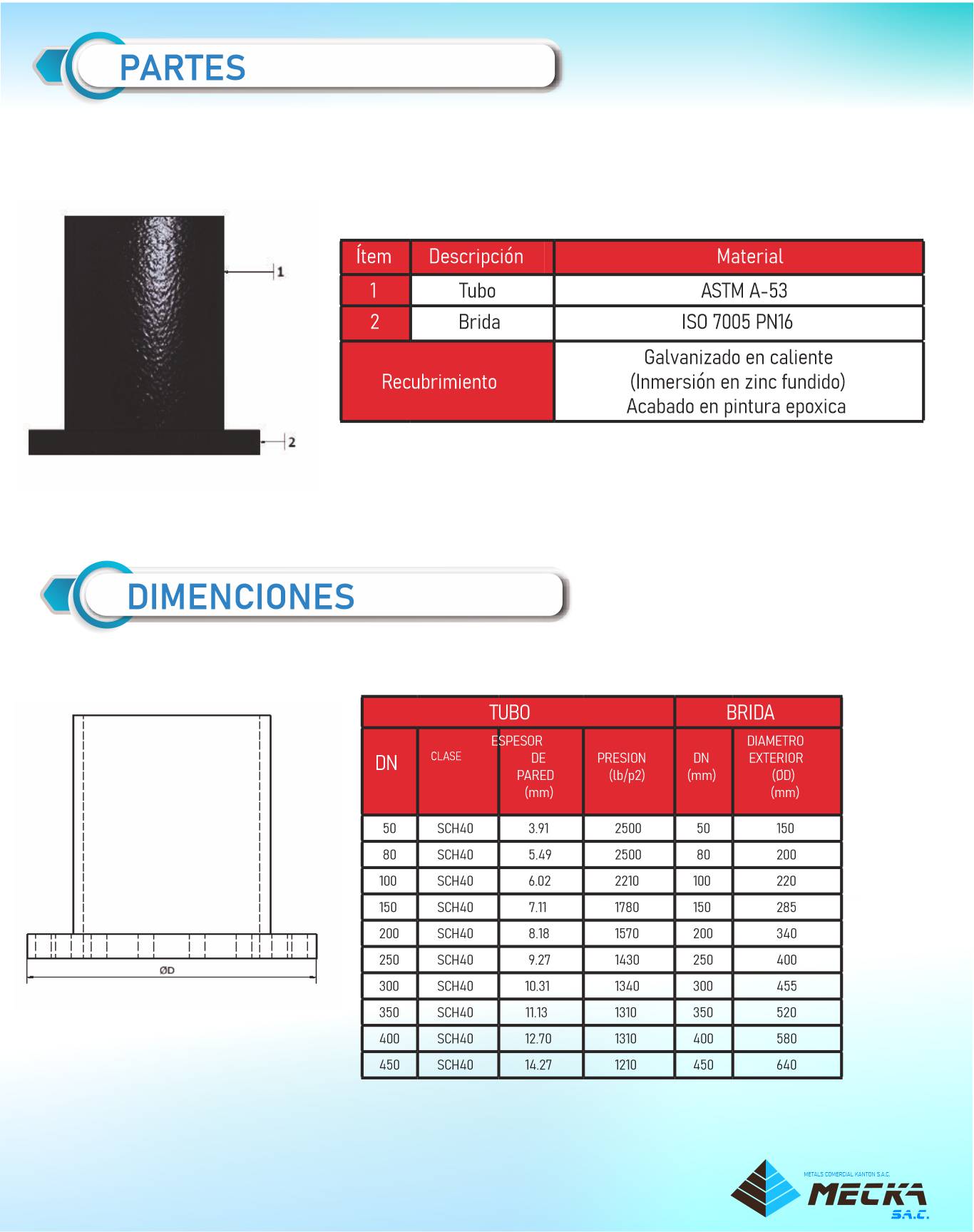 Tubo de acero sin costura con NORMA ASTM A-53 SCH 40. Brida forjada con NORMA ASTM A-105 y dimensiones con NORMA ISO 7005 PN16.